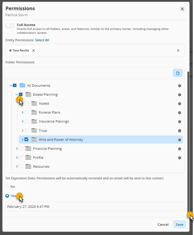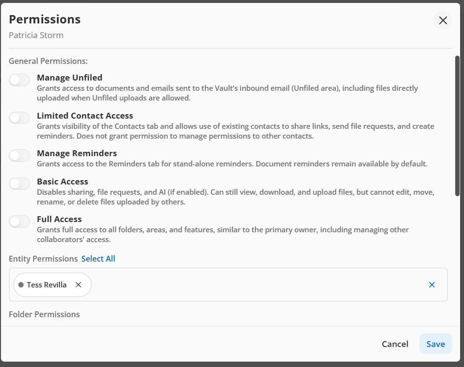 Entity Permission: If your vault contains multiple entities, you can restrict access to a single entity. The collaborator will only see documents linked to that entity, even if other documents exist in the same folder.