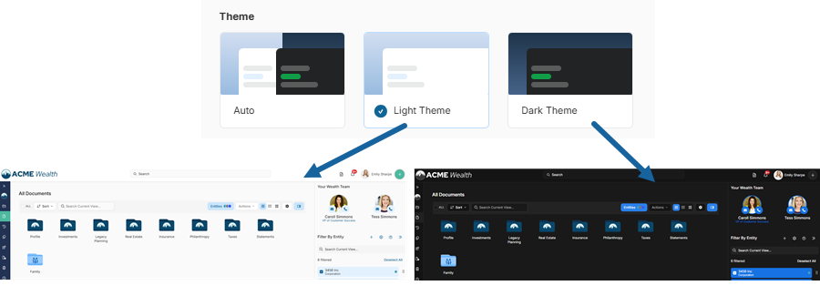 The Preferences tab in Account Settings allows you to personalize your experience, including language, theme, the location of in-app notifications, and how folders and documents are displayed.